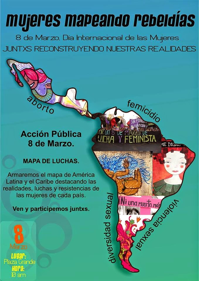 8 de Marzo – Mapeando rebeldías noviembre 3, 2025marzo 3, 2015 por Causana Invitamos a la acción pública MUJERES MAPEANDO REBELDÍAS en donde de visibilizamos las luchas y resistencias de las mujeres de Latinoamérica. DOOMINGO 8 DE MARZO 2015PLAZA GRANDE QUITO10H00 ASISTE Y ÚNETE!!